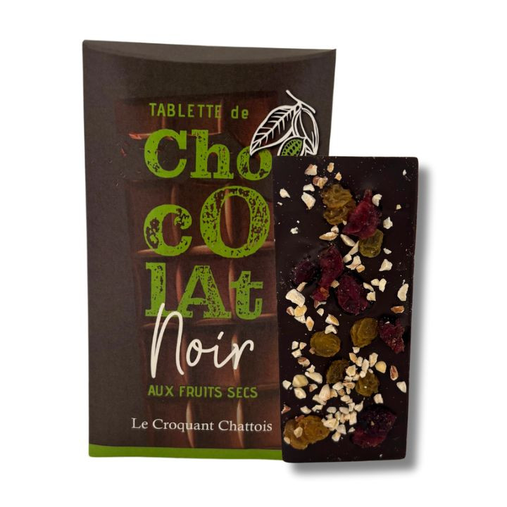 Composition : Chocolat noir 64% minimum, beurre de cacao, sucre, pâte de cacao, poudre de cacao maigre, amande, noisette, raisin sec, cranberry, émulsifiant : lécithine de soja, arôme vanille.