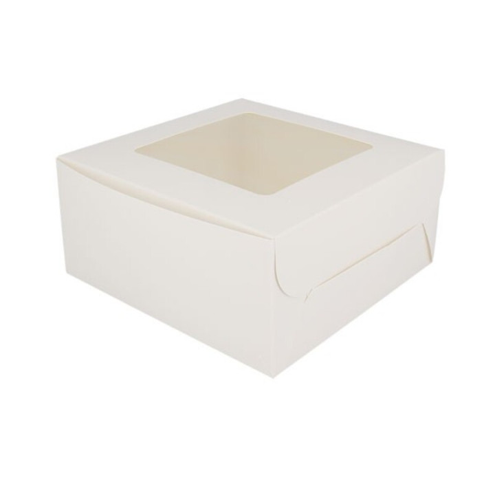 Boîte à cupcakes blanche avec fenêtre, idéale pour le transport et la présentation de 4 cupcakes. Emballage pâtissier pratique, élégant et résistant.