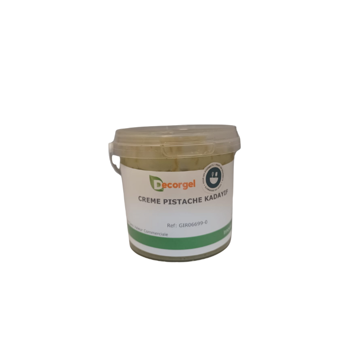 Sa composition associe une crème blanche fondante, 15 % de pâte kadaïf et 10 % de pistache, garantissant un goût riche, une texture crémeuse légèrement granuleuse et un rendu visuel naturel. Très stable, cette crème s’utilise aussi bien dans des préparations cuites que froides.
