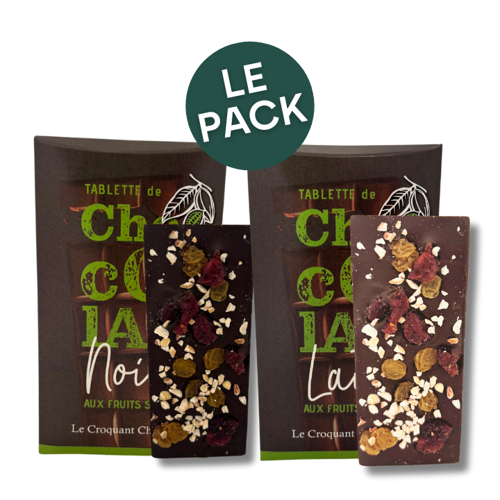 Laissez-vous tenter par notre pack duo de mini tablettes “Cocktail” : une au chocolat au lait fondant 35 %, l’autre au chocolat noir intense 64 %, toutes deux garnies d’amandes, noisettes, raisins secs et cranberries. Un équilibre parfait entre douceur et caractère, signé PourLesGourmets.