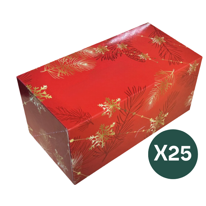 Boîte à bûche Vermeil XL, 30 cm de long et 13 cm de hauteur. Lot de 25 boîtes en carton rouge et doré, parfaites pour les bûches hautes, généreuses et décorées.