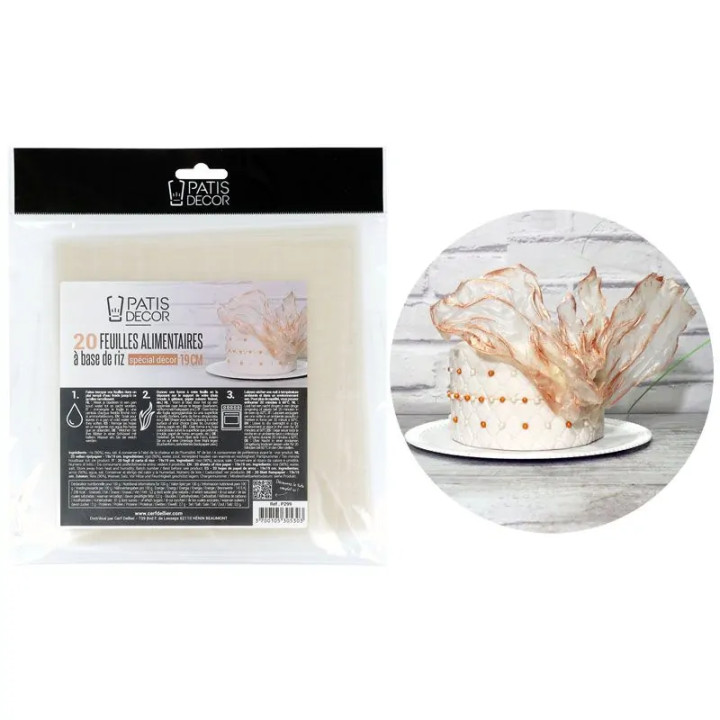 Les feuilles alimentaires à base de riz Patisdécor (x20) sont idéales pour réaliser des décorations pâtissières originales et élégantes. Faciles à travailler, elles permettent de créer des décorations fines et légères pour gâteaux, entremets et desserts.