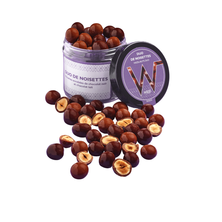 Savourez le duo de noisettes Weiss : de délicieuses noisettes croquantes enrobées de chocolat noir et de chocolat au lait. Une gourmandise raffinée présentée dans un pot de 125 g, parfaite pour les amateurs de fruits secs et de chocolat.
