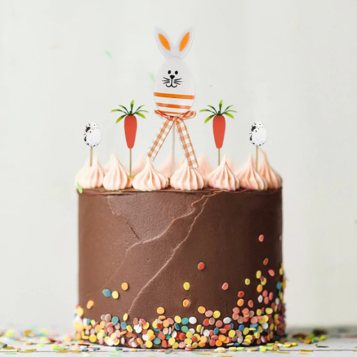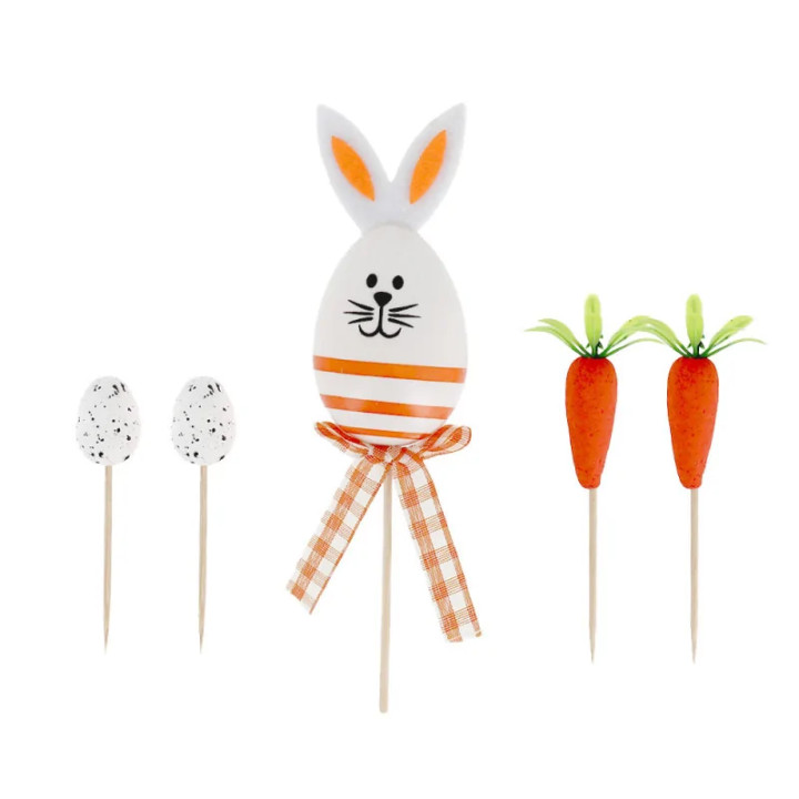 Ce set de décors à piquer thème Pâques est parfait pour décorer facilement vos gâteaux et entremets lors des fêtes pascales. Composé de 5 éléments décoratifs, il comprend un lapin de Pâques, deux carottes et deux œufs décoratifs montés sur pics, permettant une mise en place rapide et élégante sur toutes vos pâtisseries.