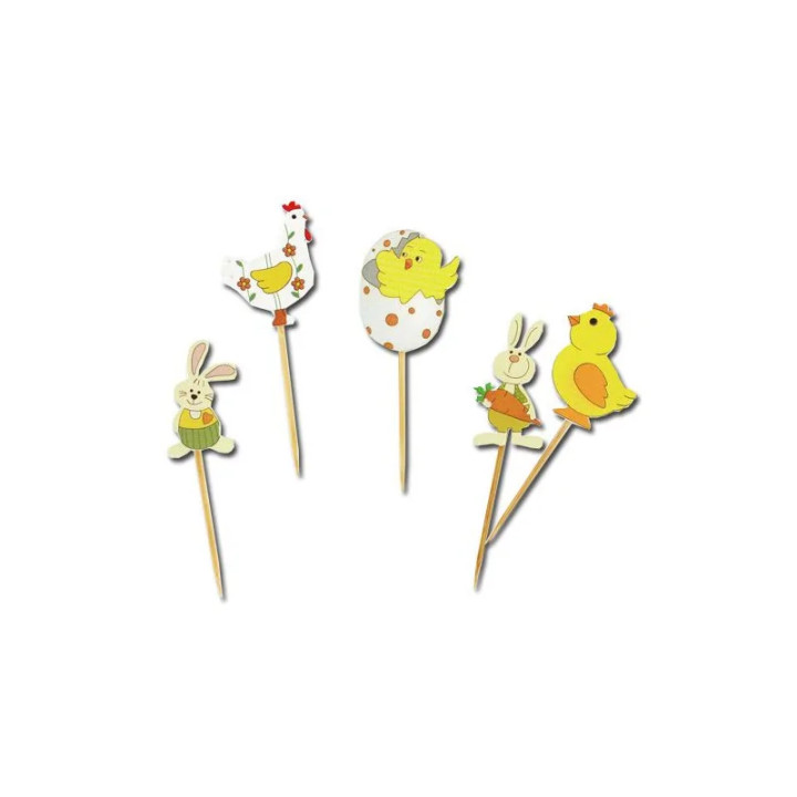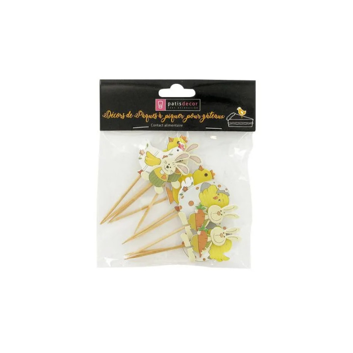 Montés sur des pics en bois, ces décors se plantent facilement dans vos gâteaux, entremets, cupcakes ou tartes afin de créer une décoration rapide et efficace. Ils permettent d’ajouter instantanément une ambiance de Pâques à vos desserts, que ce soit pour une table de fête, une vitrine de pâtisserie ou un événement gourmand.