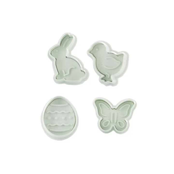 Réalisez facilement des décorations pâtissières avec ce set de 4 découpoirs éjecteurs thème Pâques. Idéal pour découper et marquer pâte à sucre, pâte d’amande ou pâte à biscuit avec des formes de lapin, poussin, œuf et papillon.