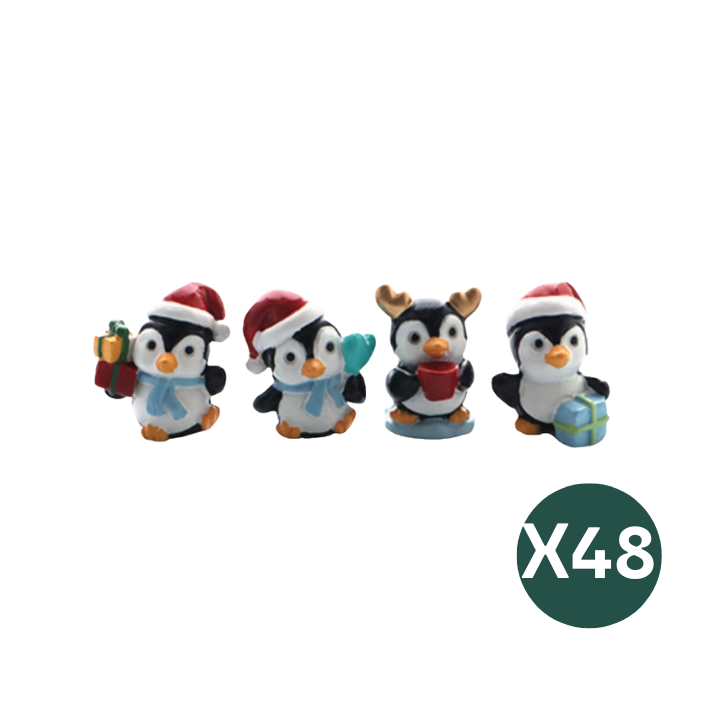 Chaque lot comprend 48 figurines assorties, représentant de petits pingouins vêtus de bonnets rouges et d’écharpes bleues, tenant des cadeaux, tasses ou accessoires hivernaux.